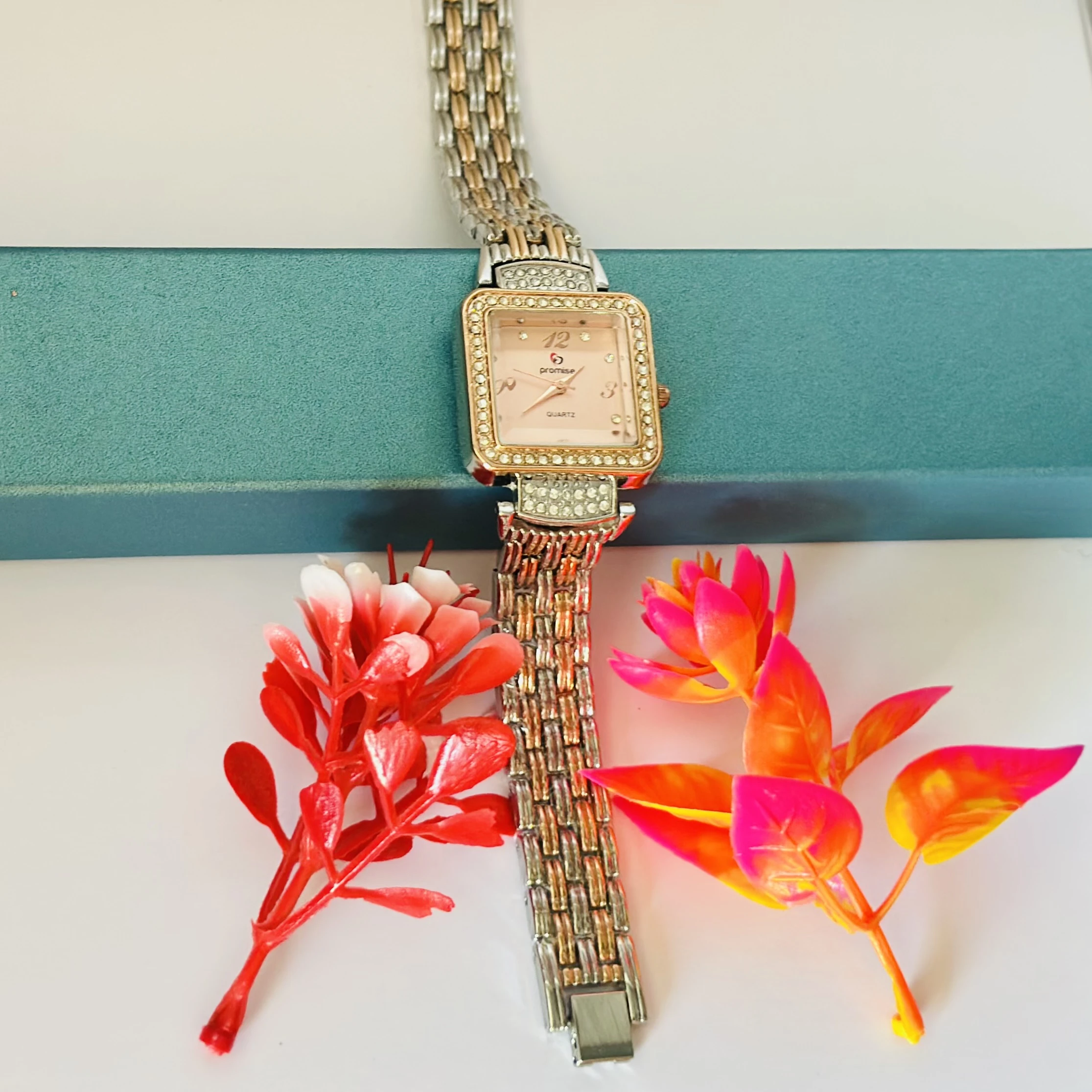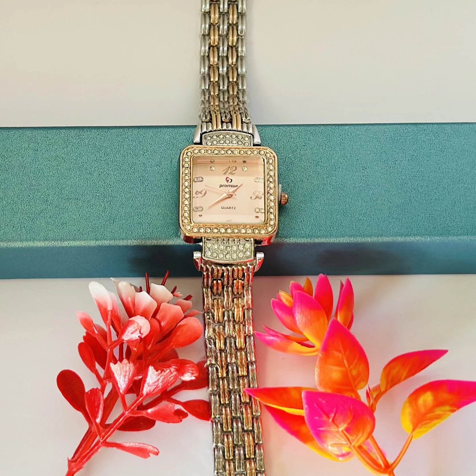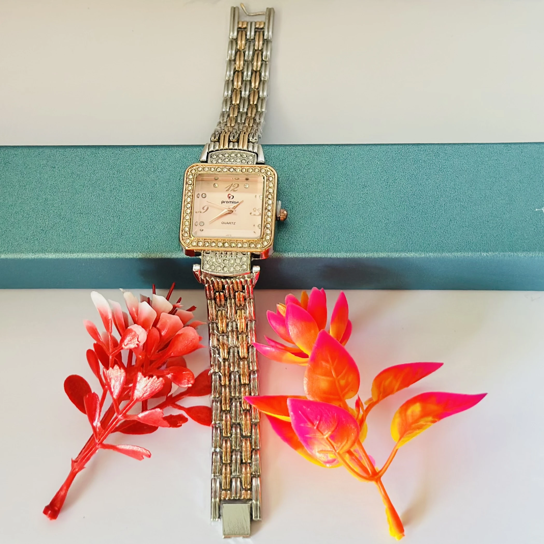 👉 Theme :- women's square-dial quartz watch with a two-tone rose gold and silver-tone metal chain bracelet and rhinestone bezel.