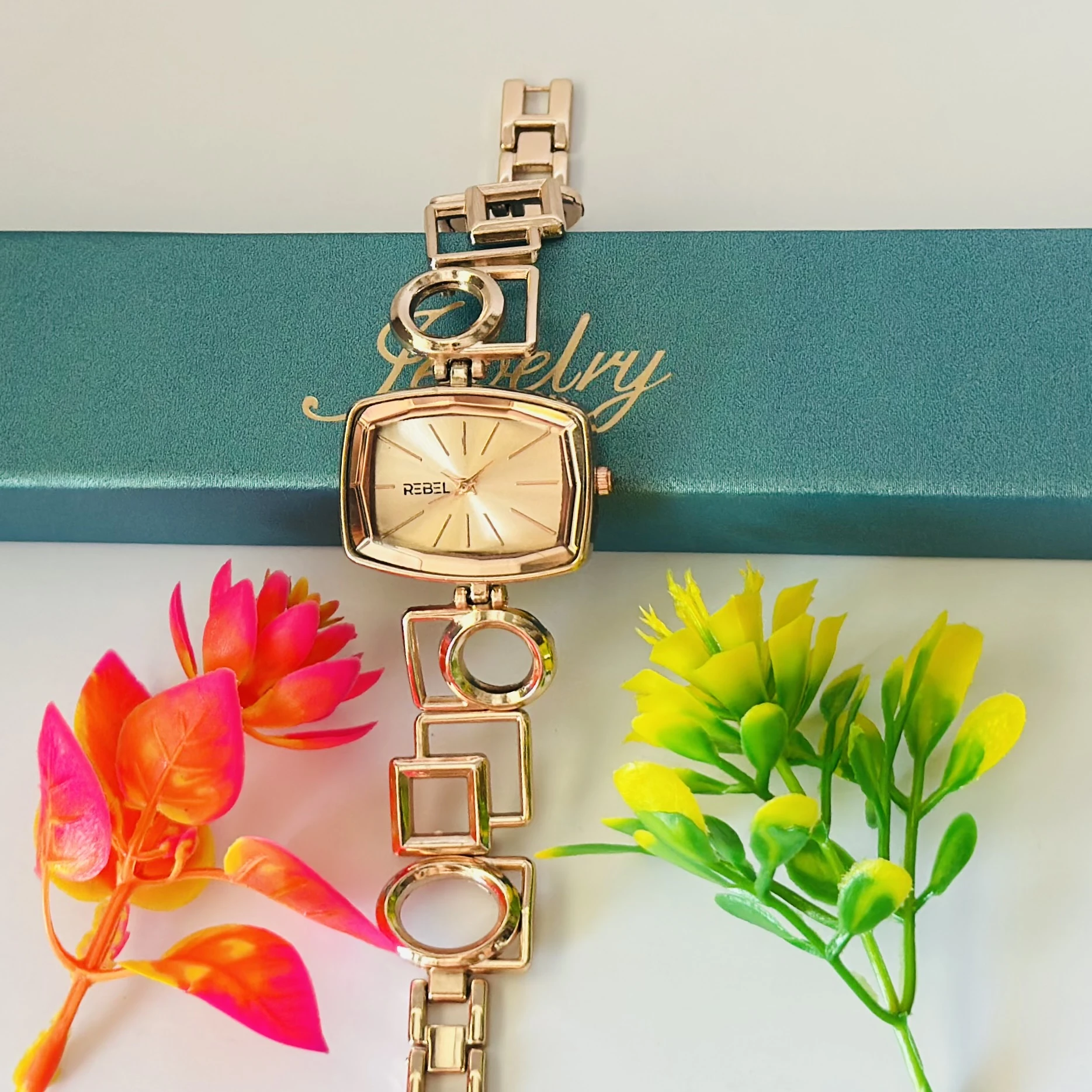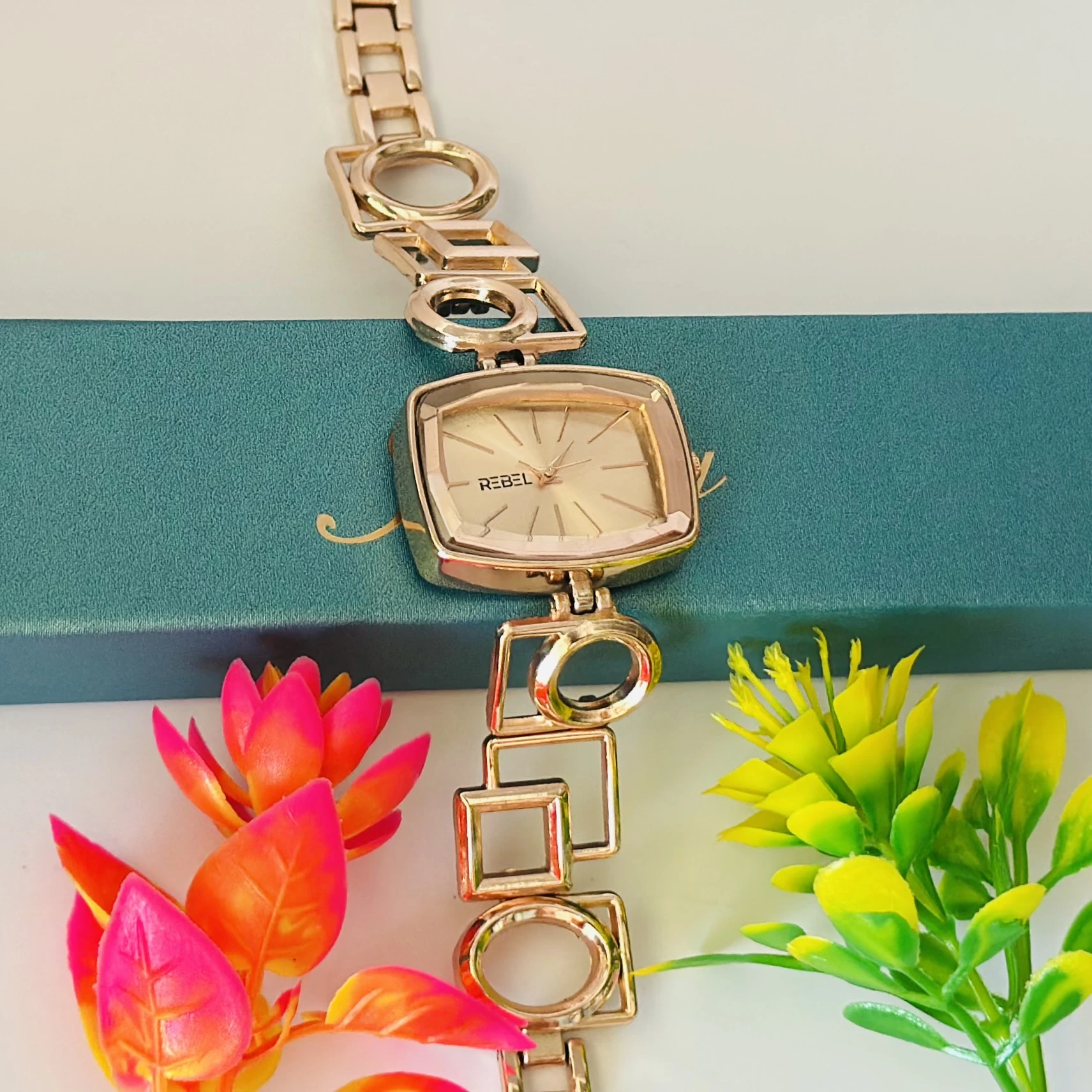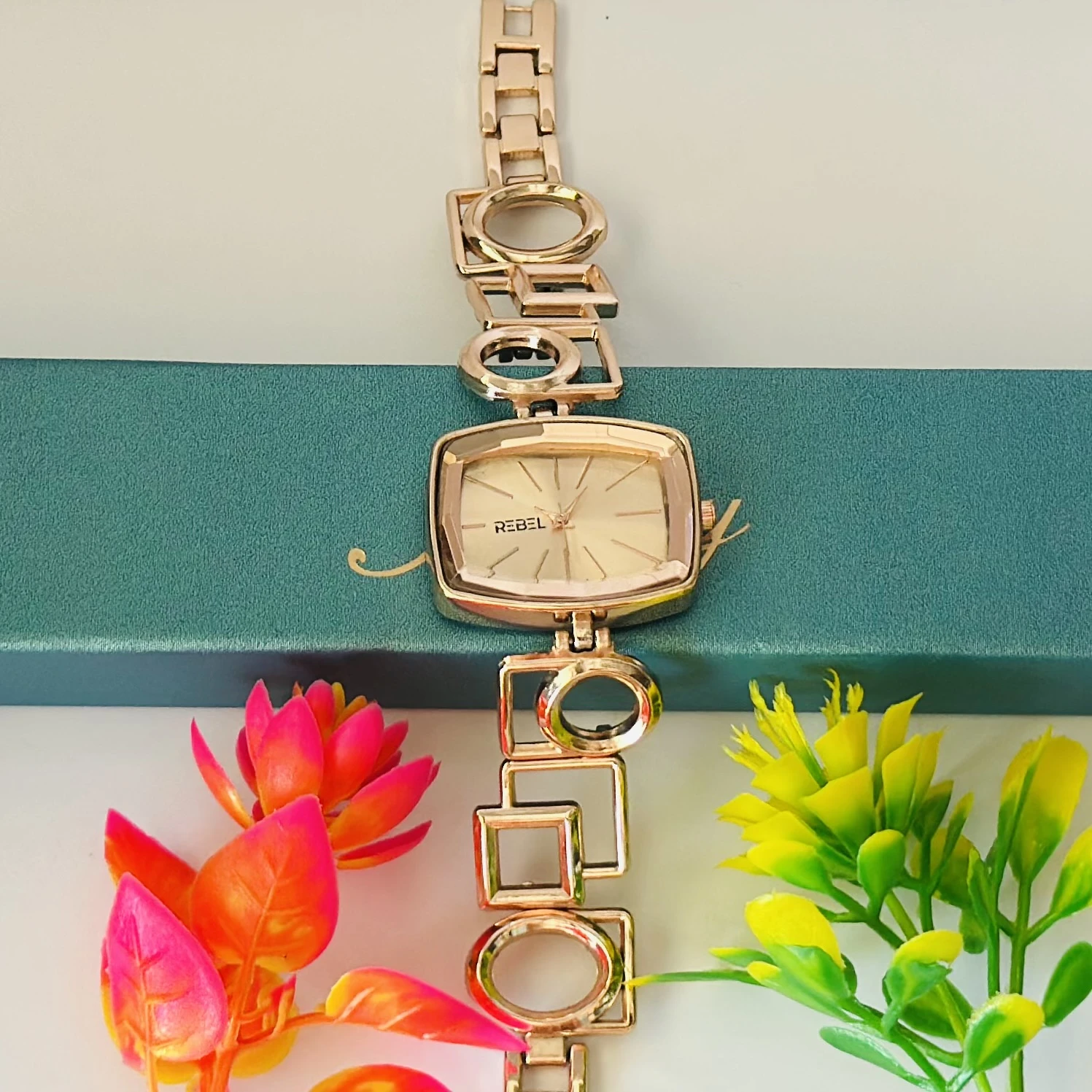 👉 Theme :- Women’s analogue watch rose gold-toned metal bracelet with geometric shapes and a minimalistic dial.