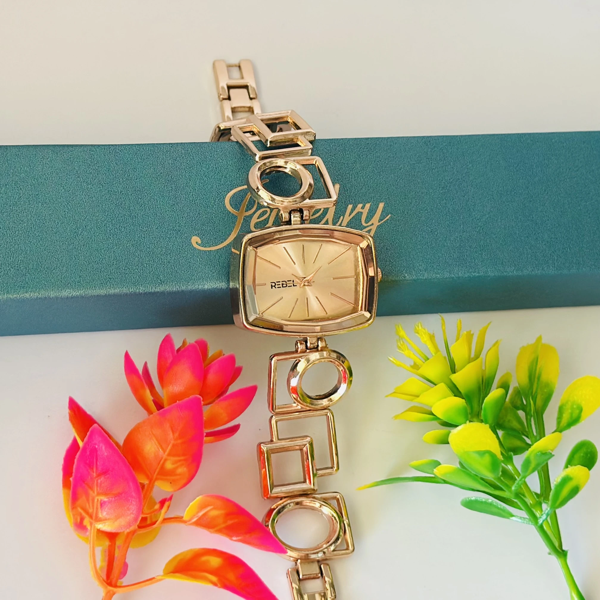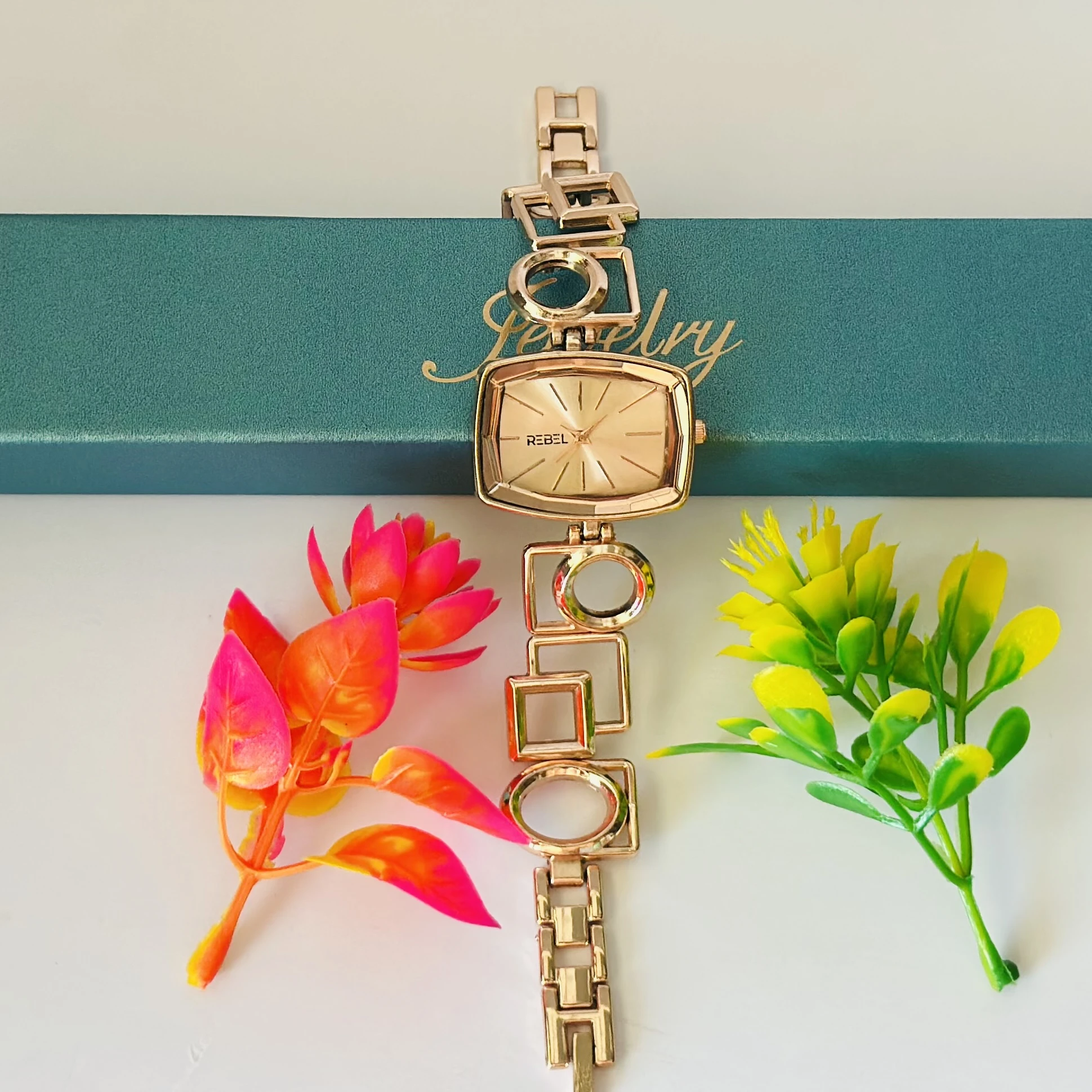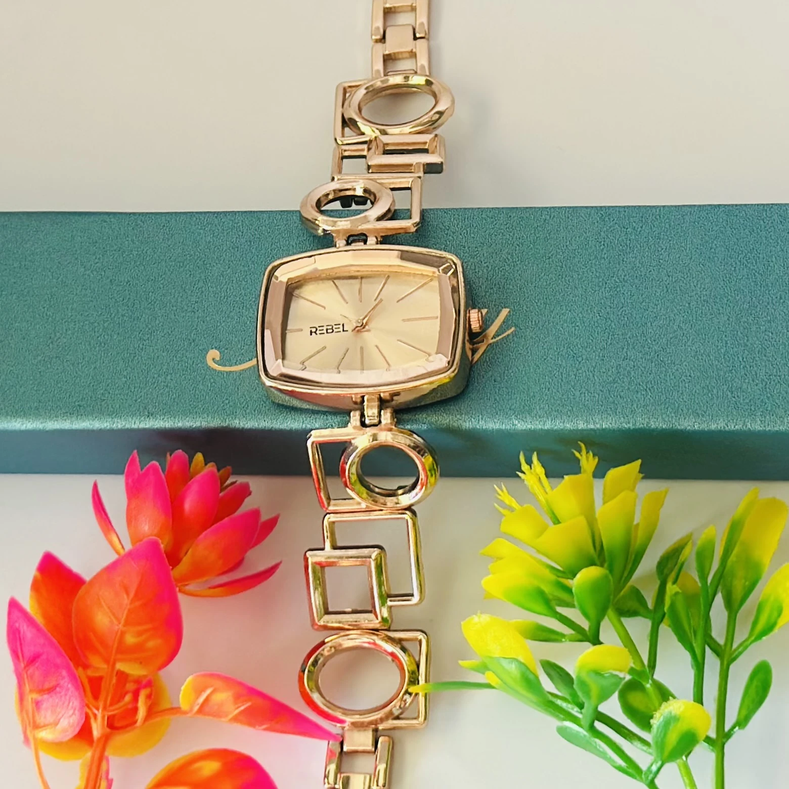👉 Theme :- Women’s analogue watch rose gold-toned metal bracelet with geometric shapes and a minimalistic dial.