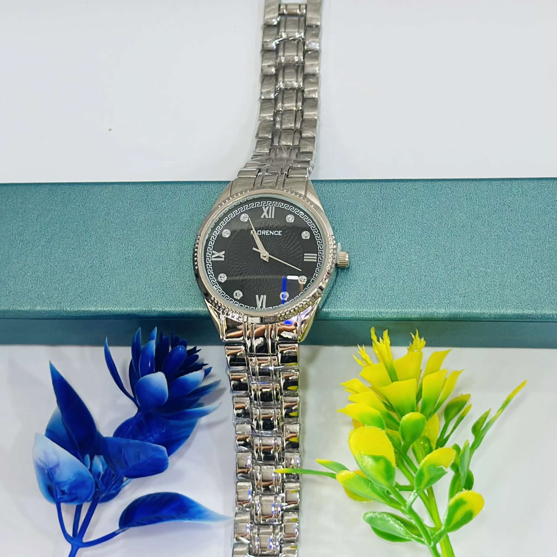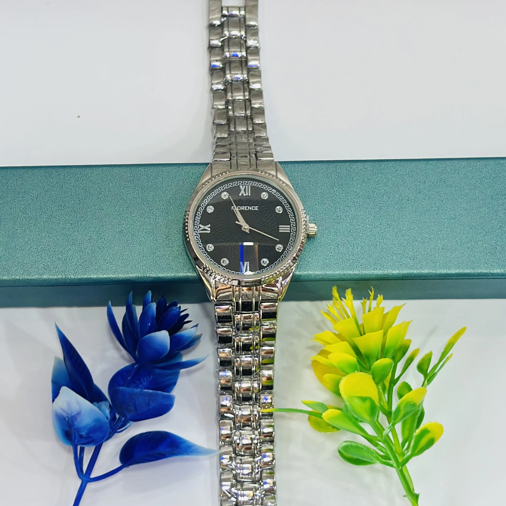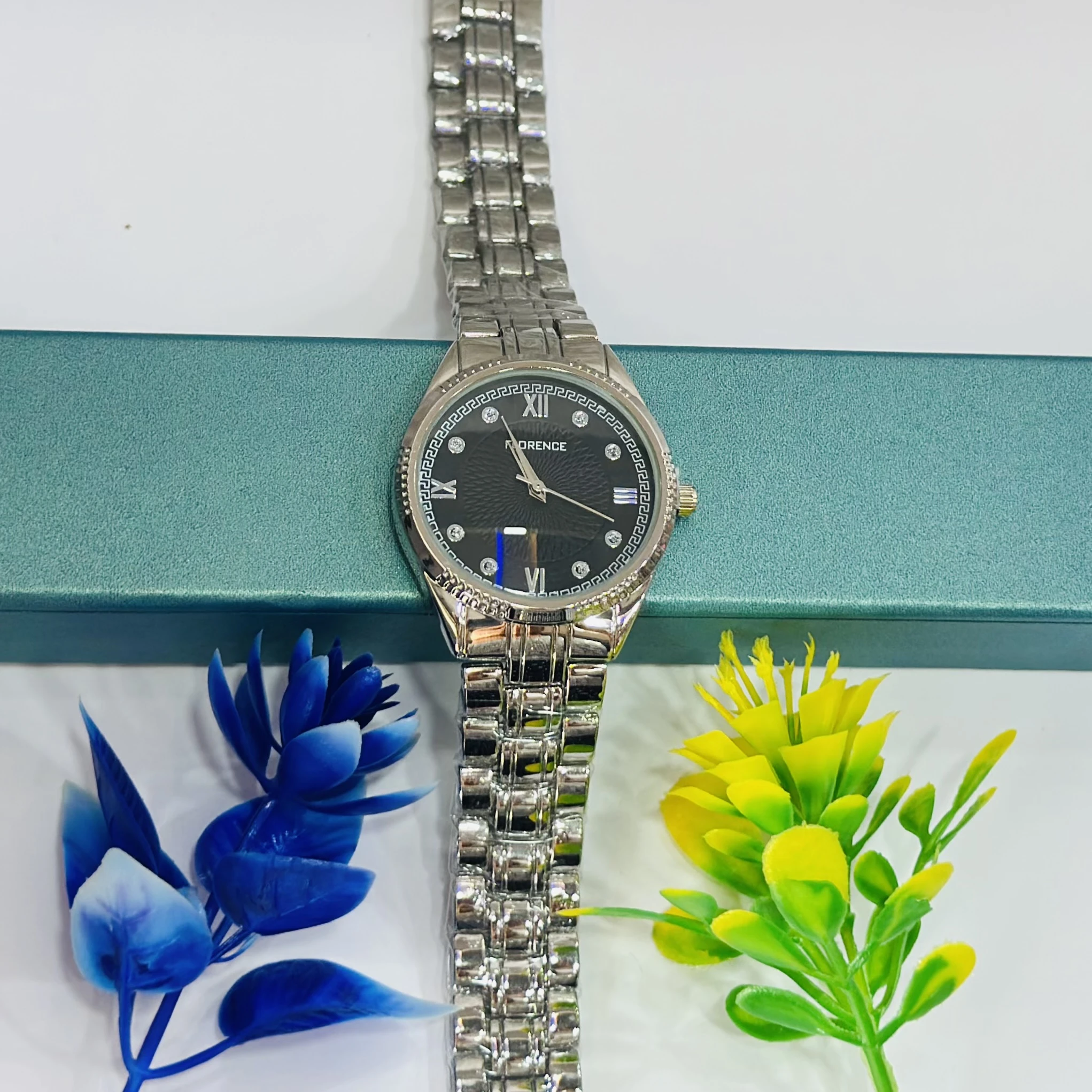 👉 Theme :- Women’s analog watch with a silver stainless steel strap and black dial