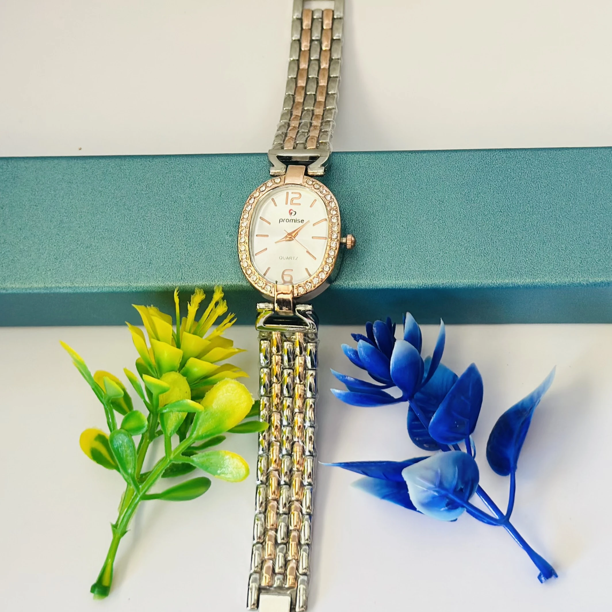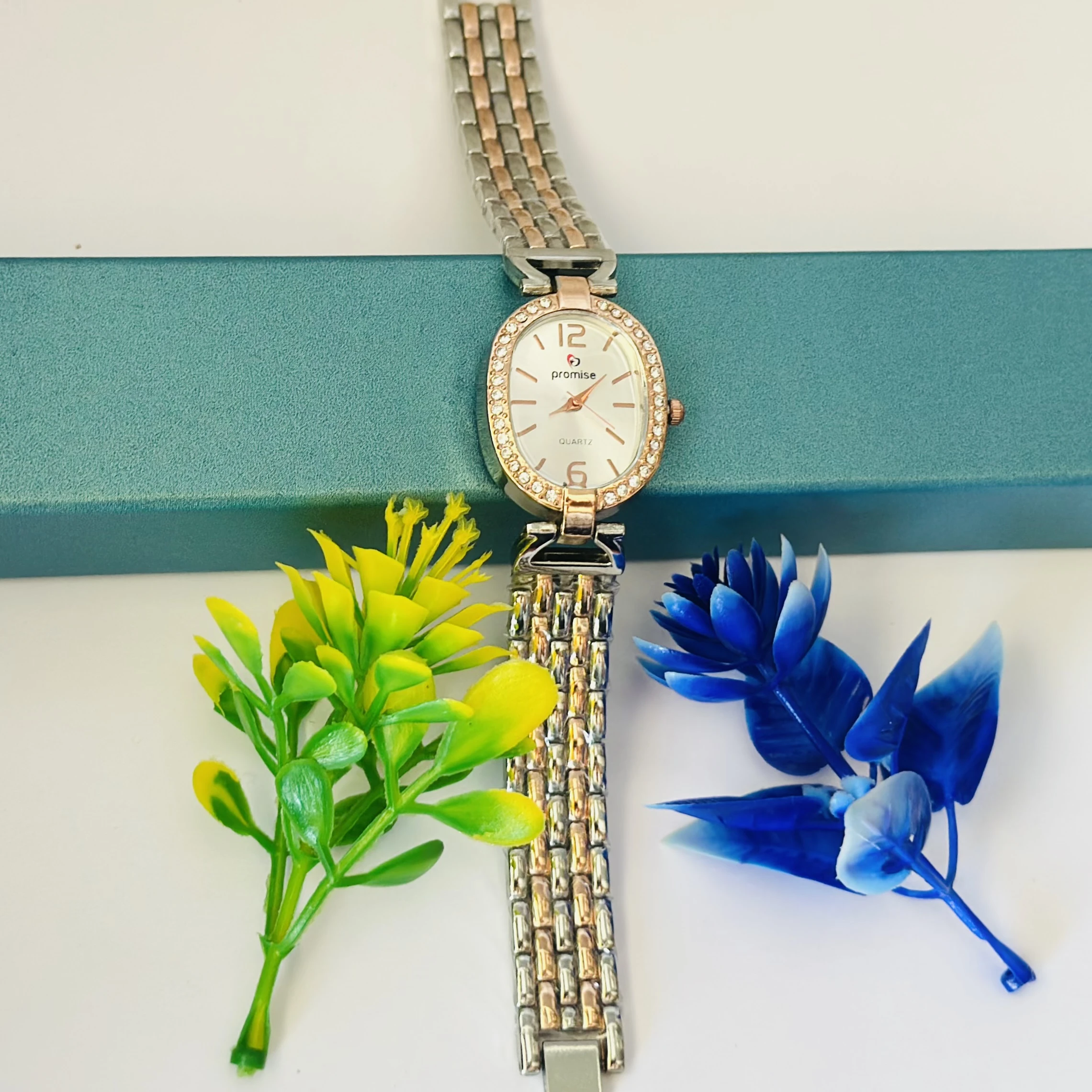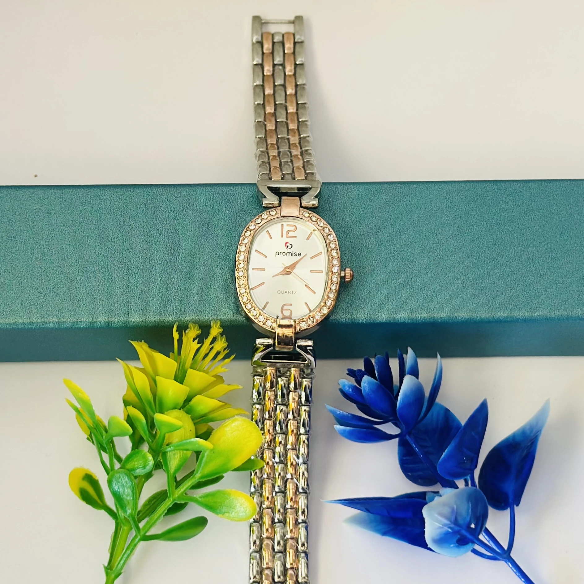 👉 Theme :- women's quartz watch with a two-toned (gold and silver) stainless steel bracelet strap and an oval, embellished white dial.