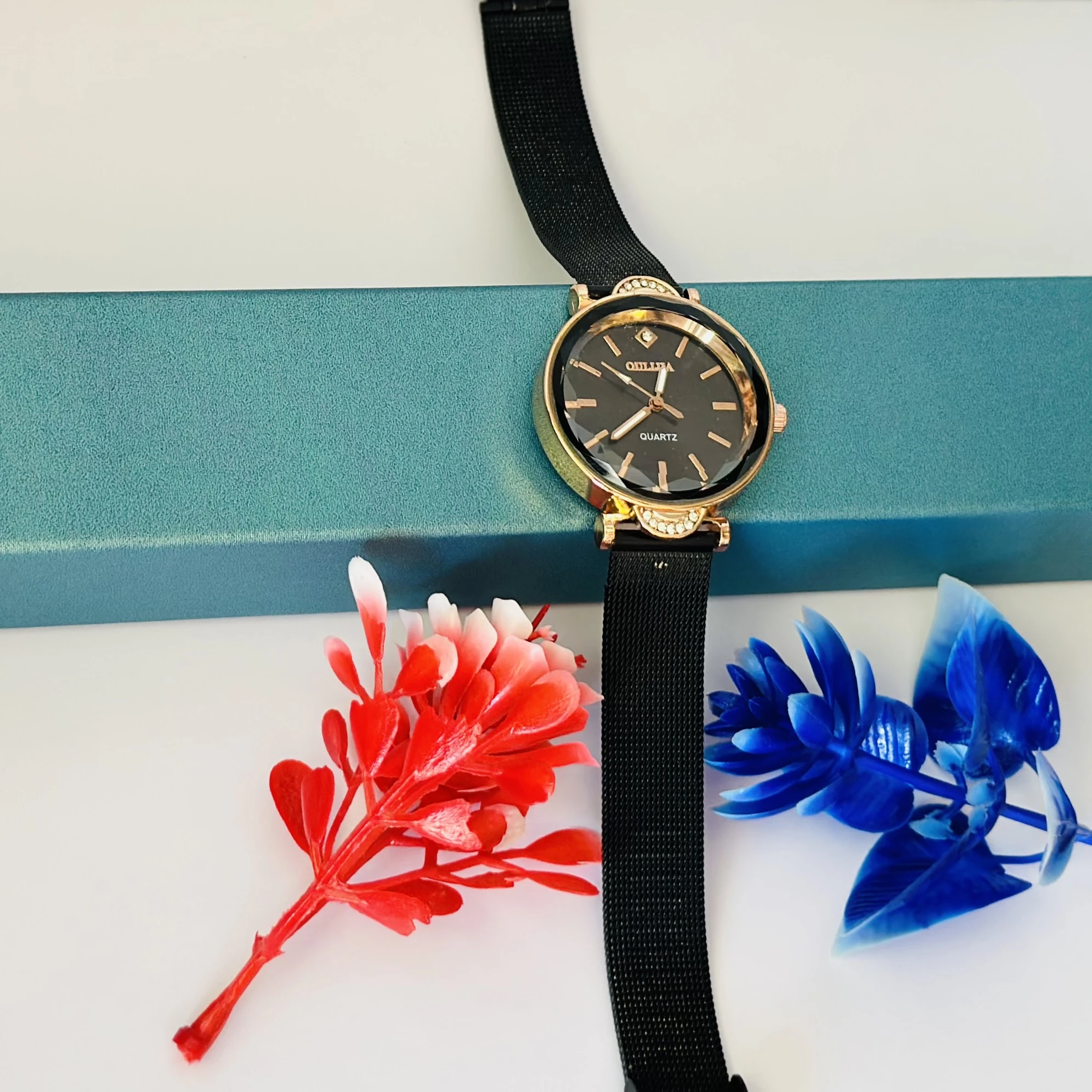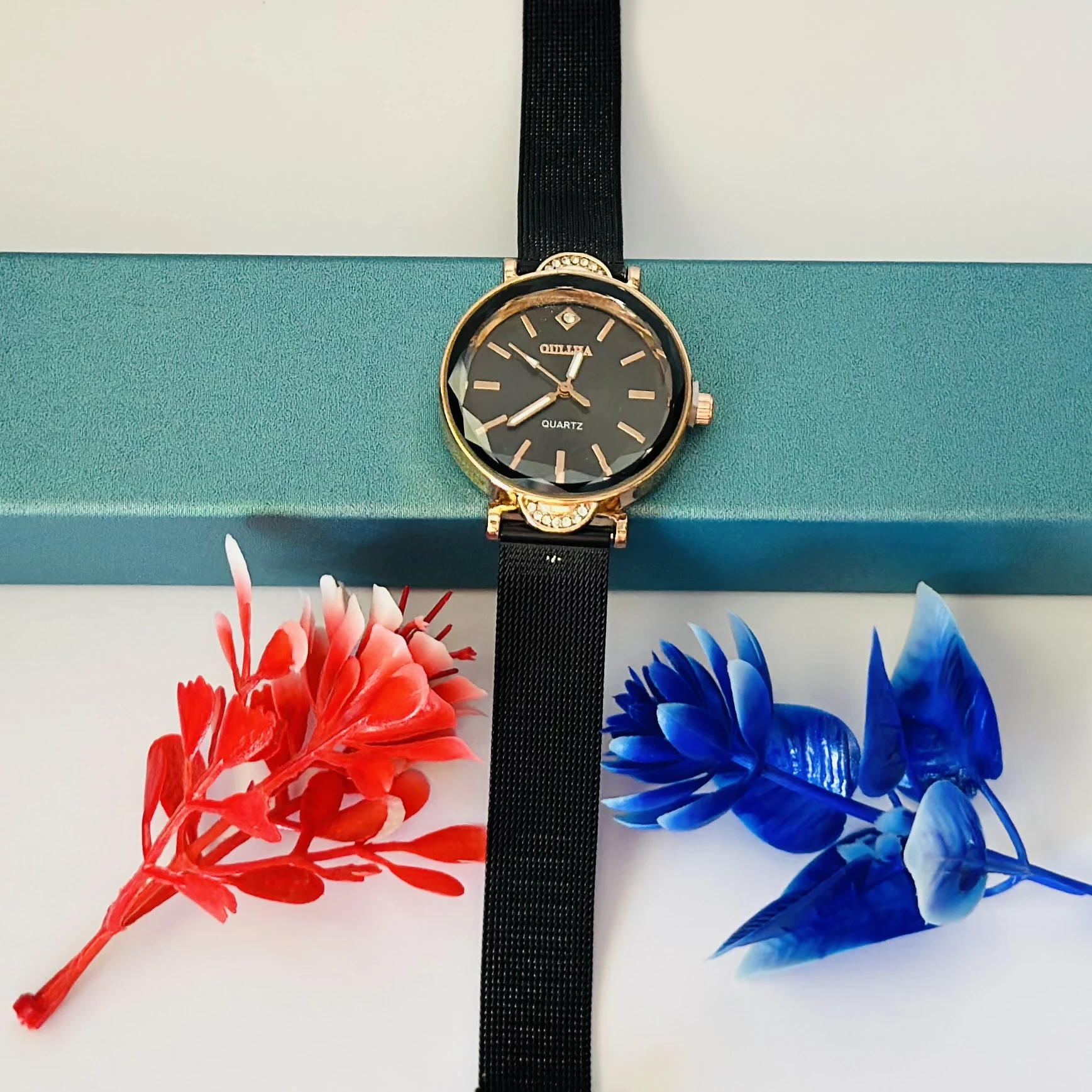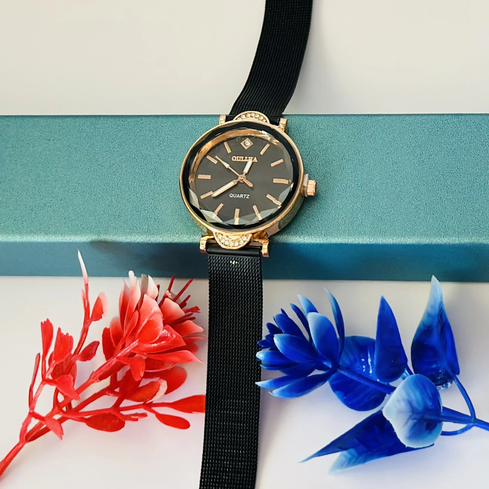 👉 Theme :- women's black mesh watch with a rose gold-tone case and a crystal accent.
