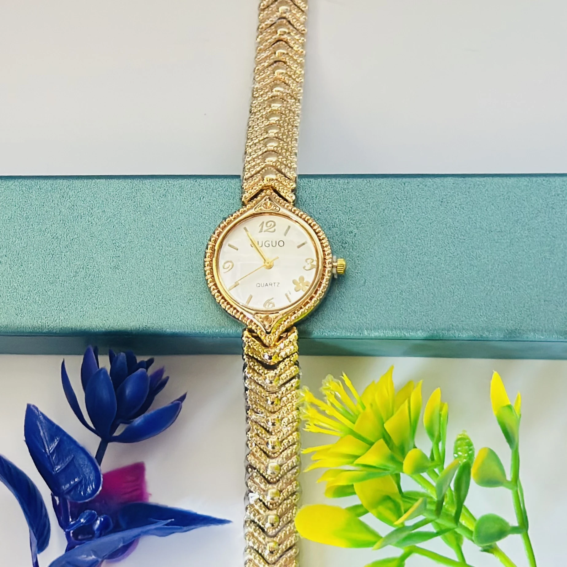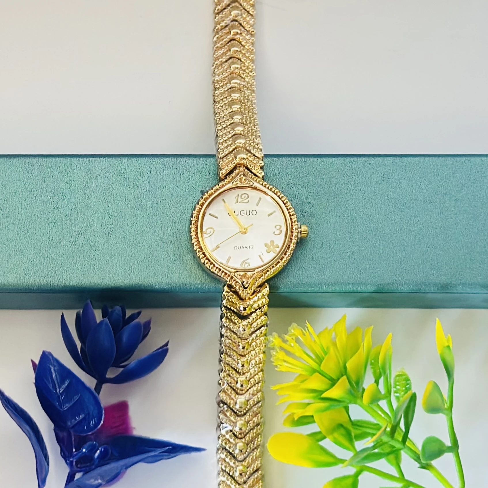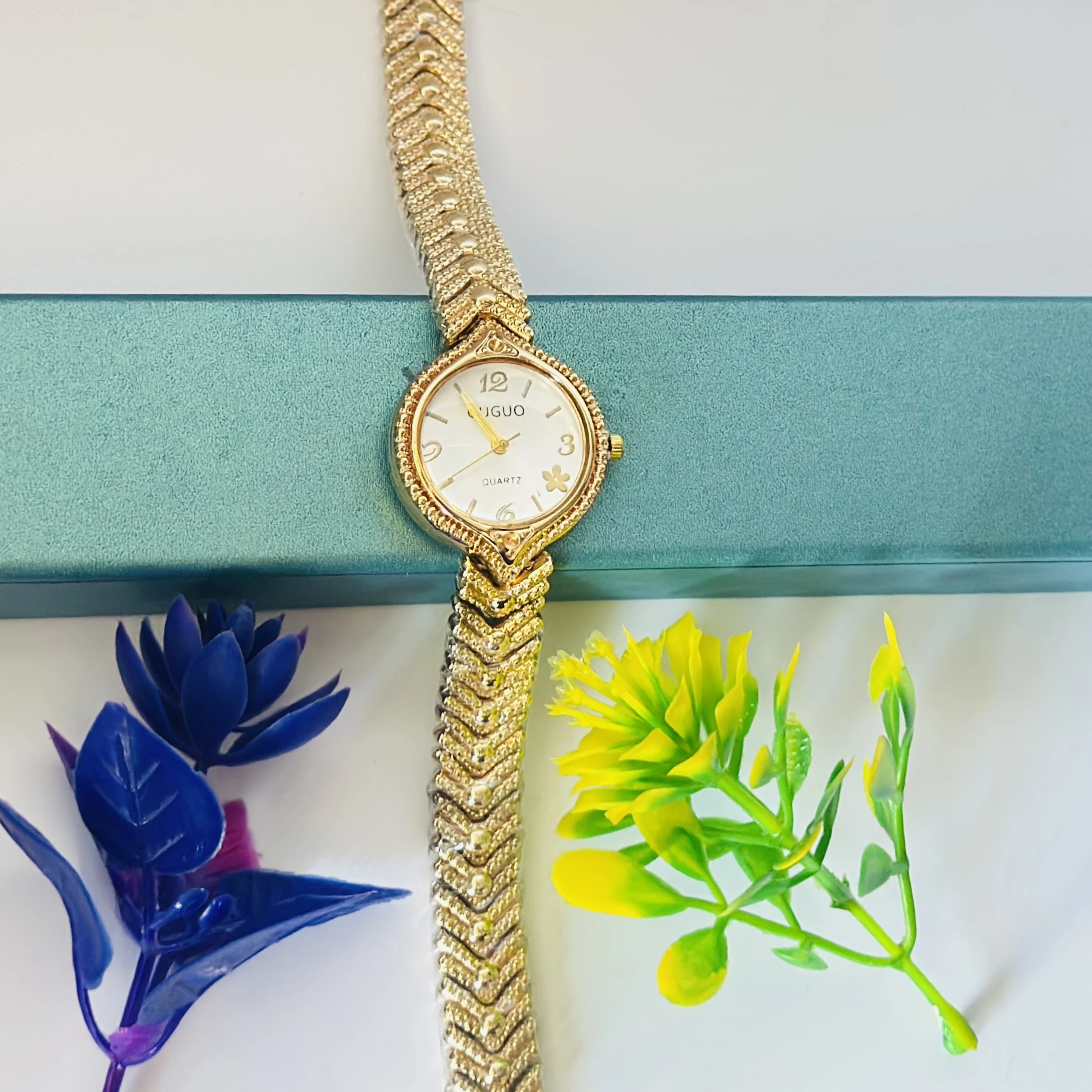 👉 Theme :- women's gold-toned analog quartz wristwatch with a metal strap.