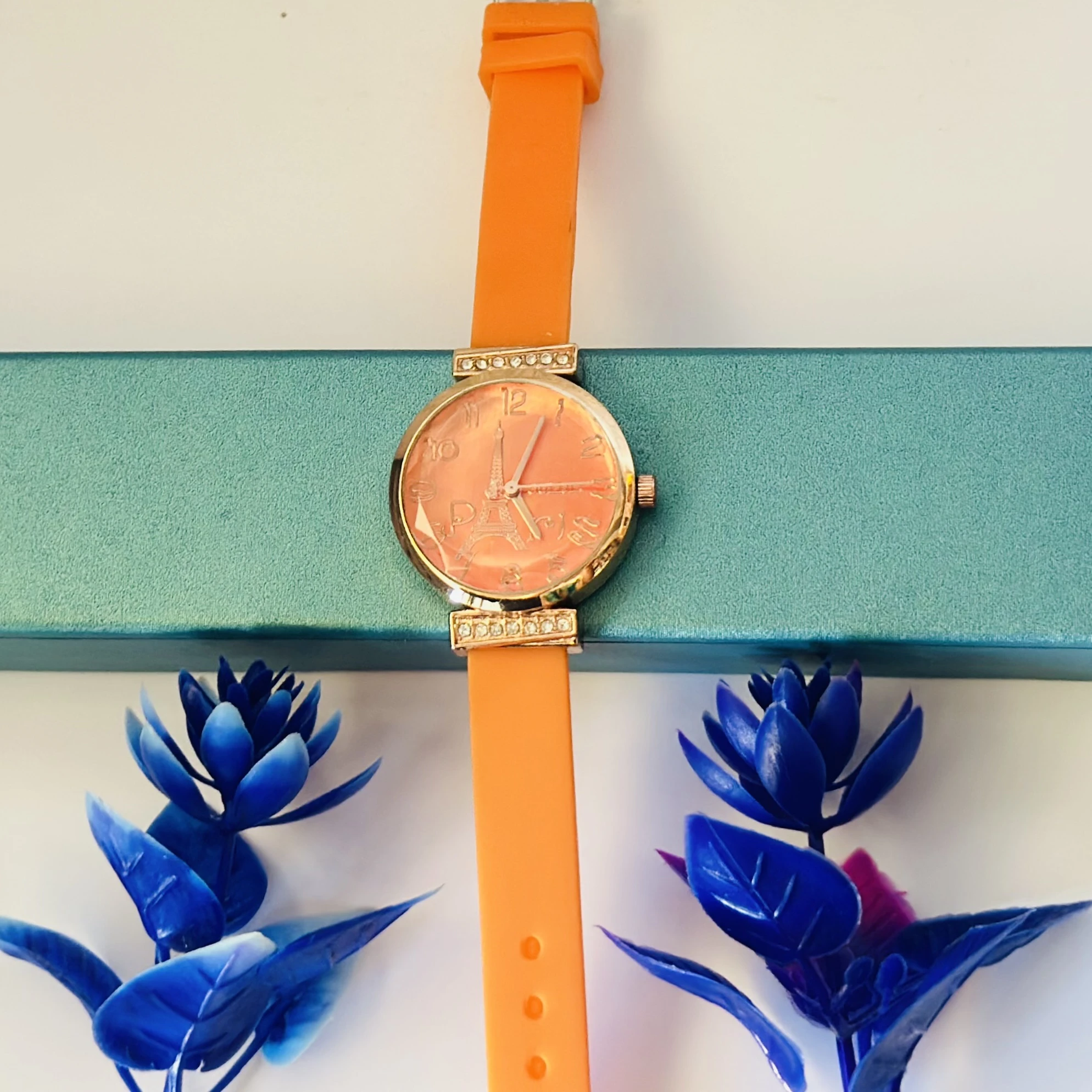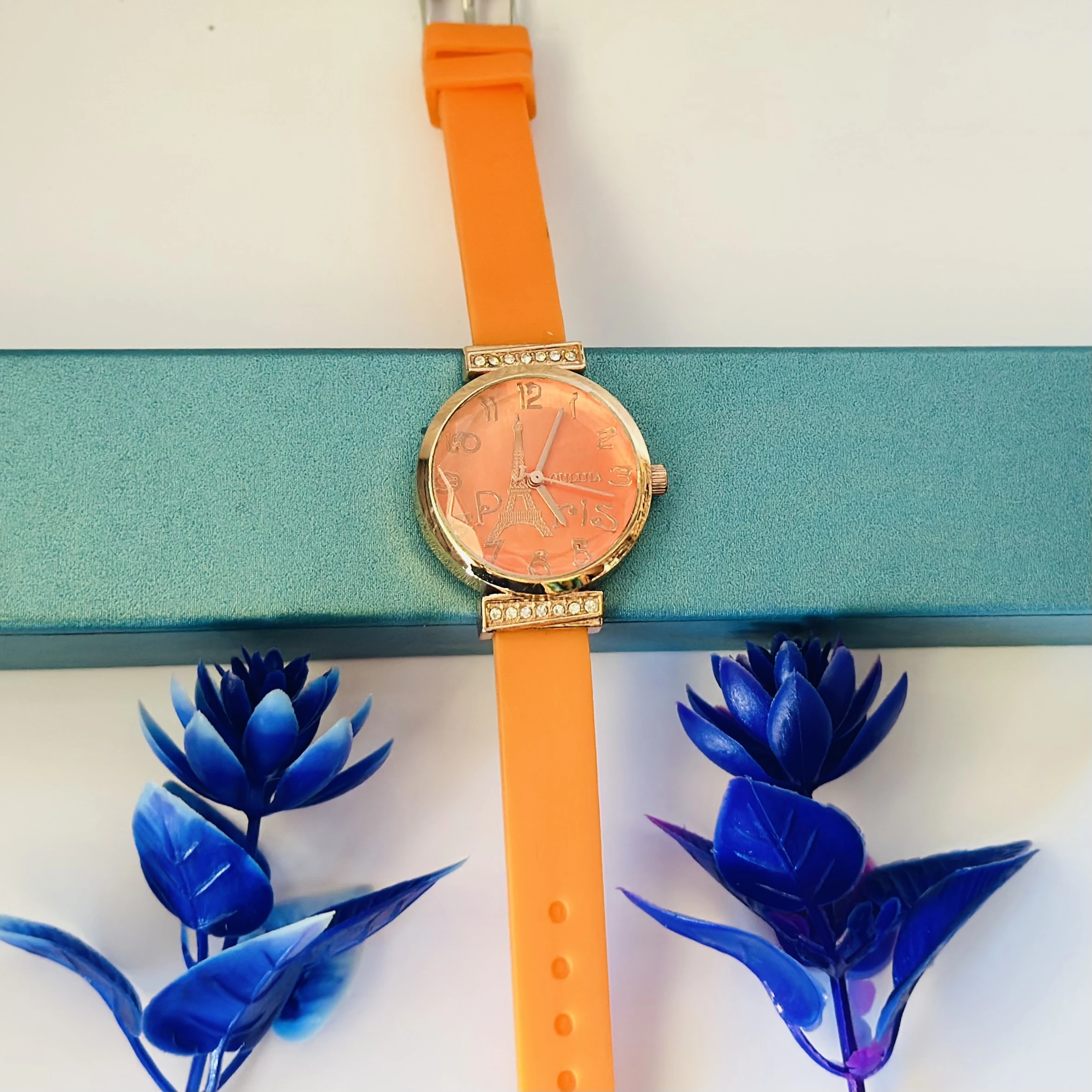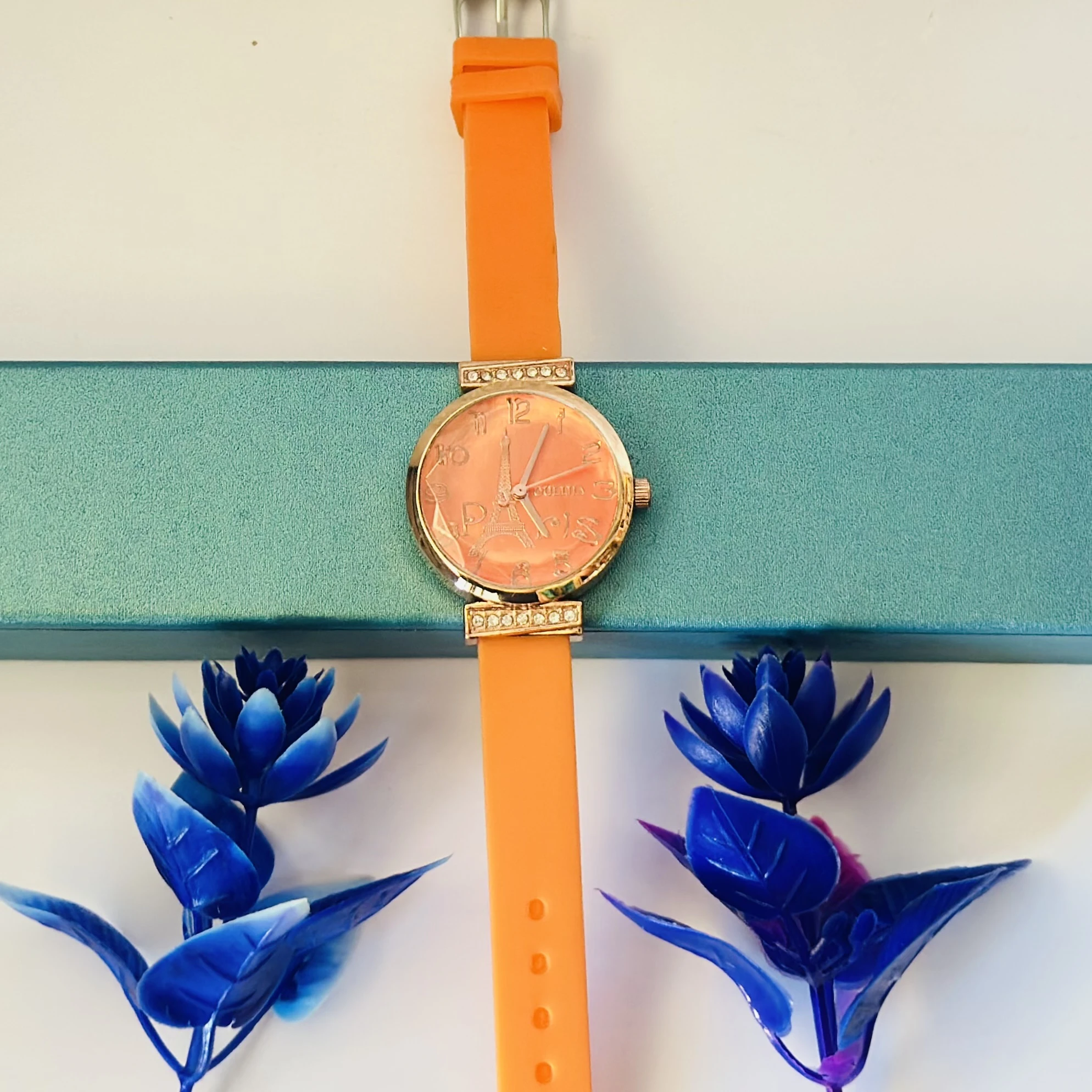 👉 Theme :- Women's Metal Analog Watch with an orange silicone strap