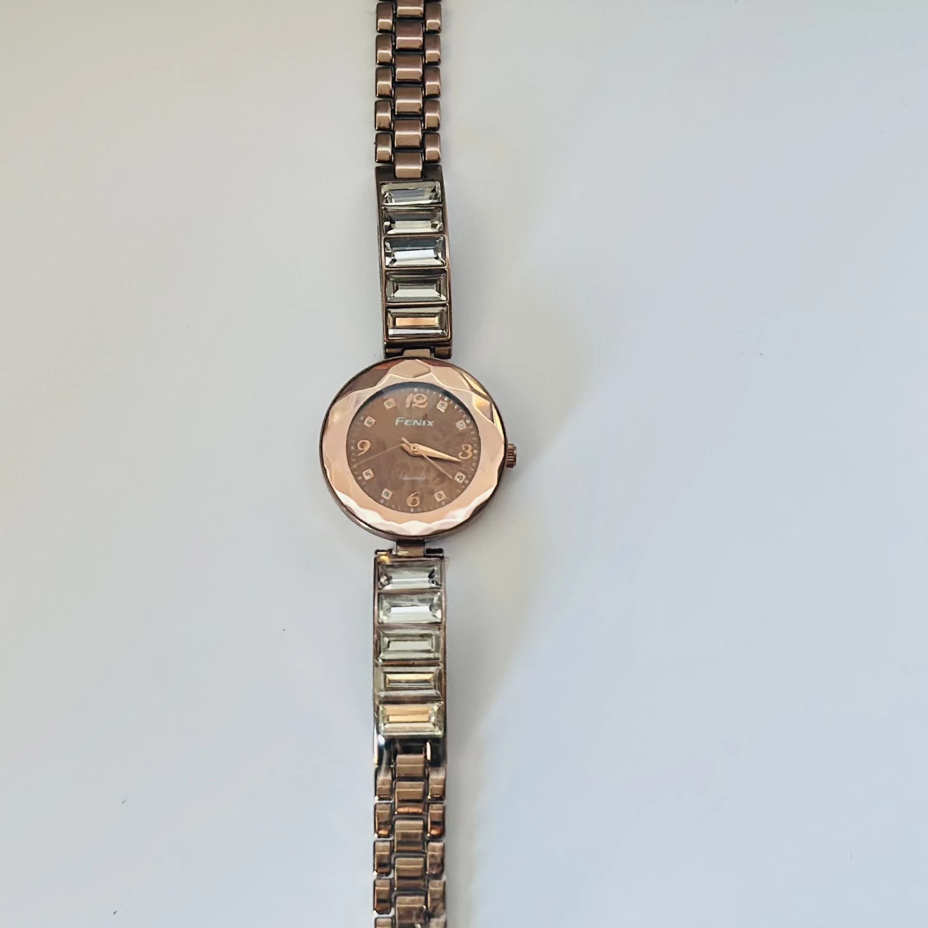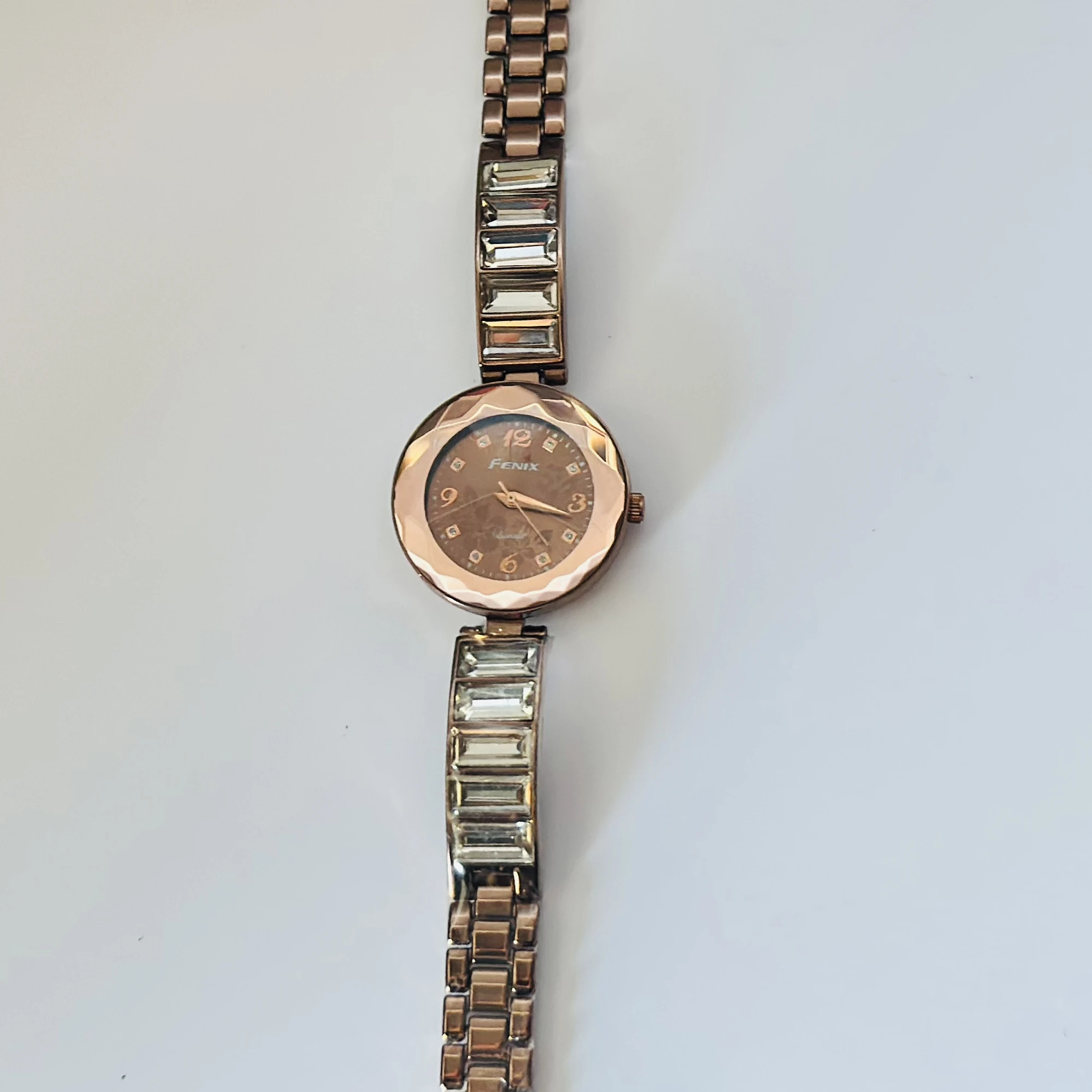 👉 Theme :- women's rose gold-tone analog watch with a crystal-accented bracelet.