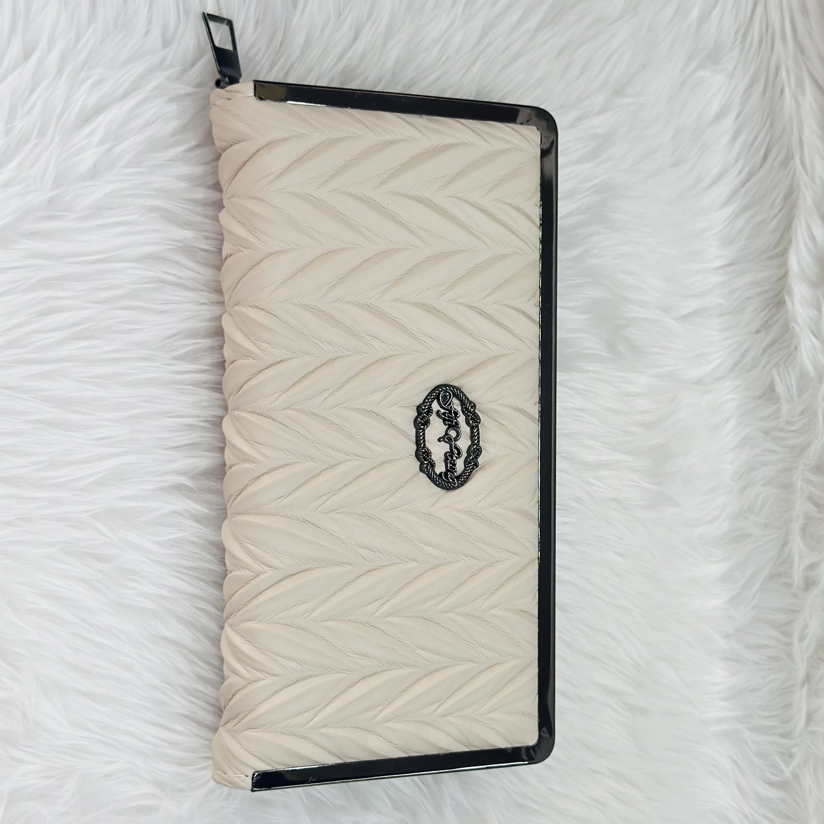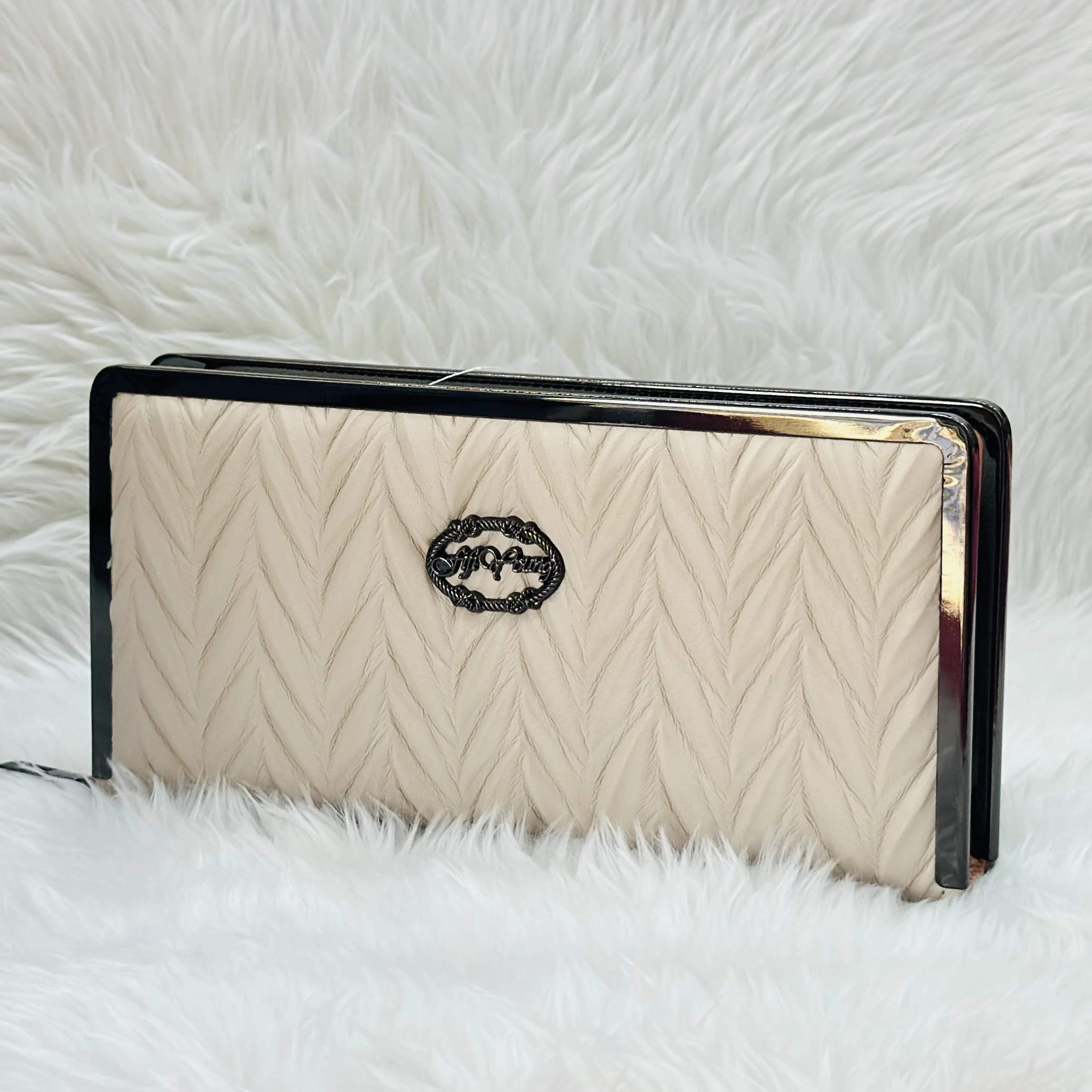 👉 Theme :- women's PU leather hard-case clutch with a diagonal quilted texture and a metal frame with a clasp lock.