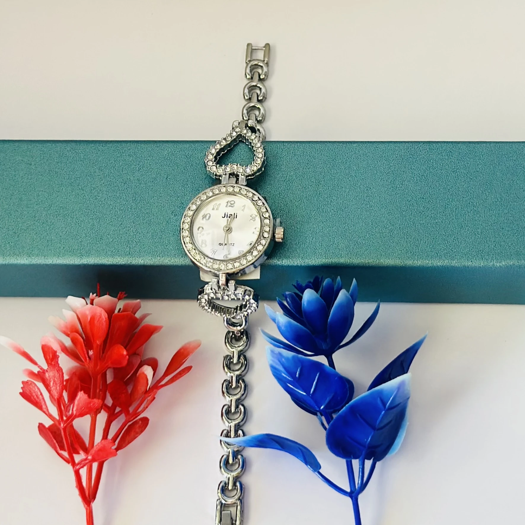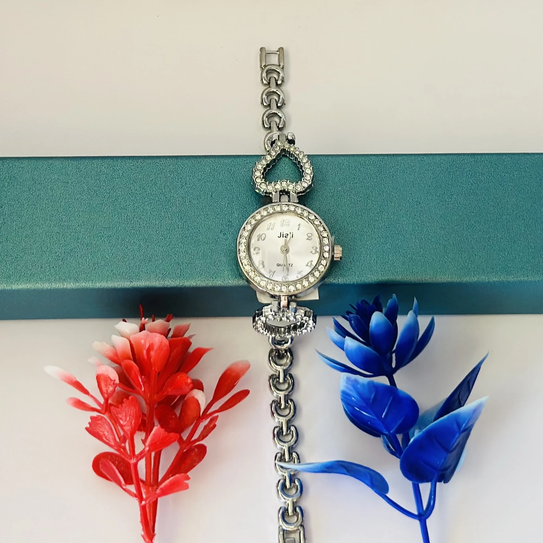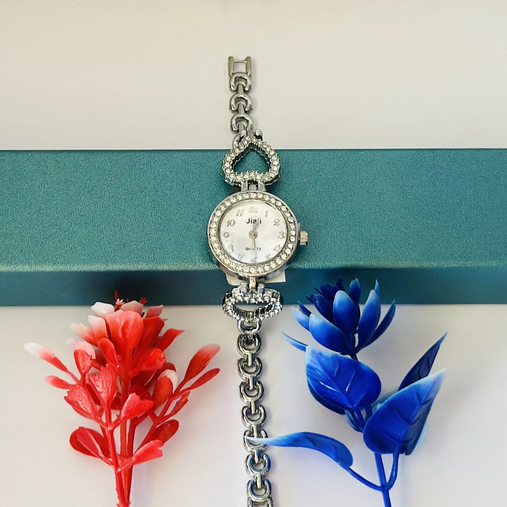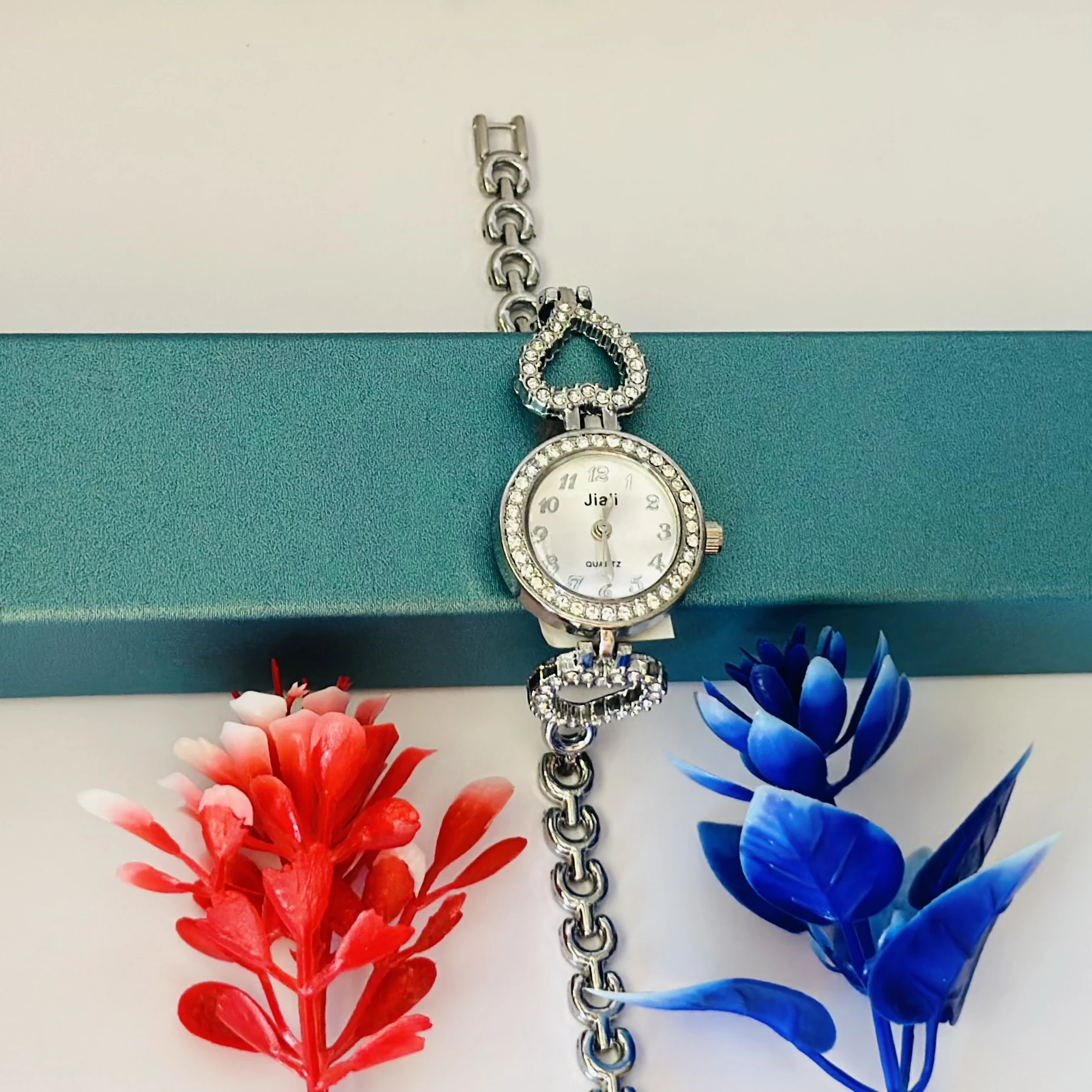 👉 Theme :- Women’s watch with a silver metal bracelet and crystal-studded bezel.