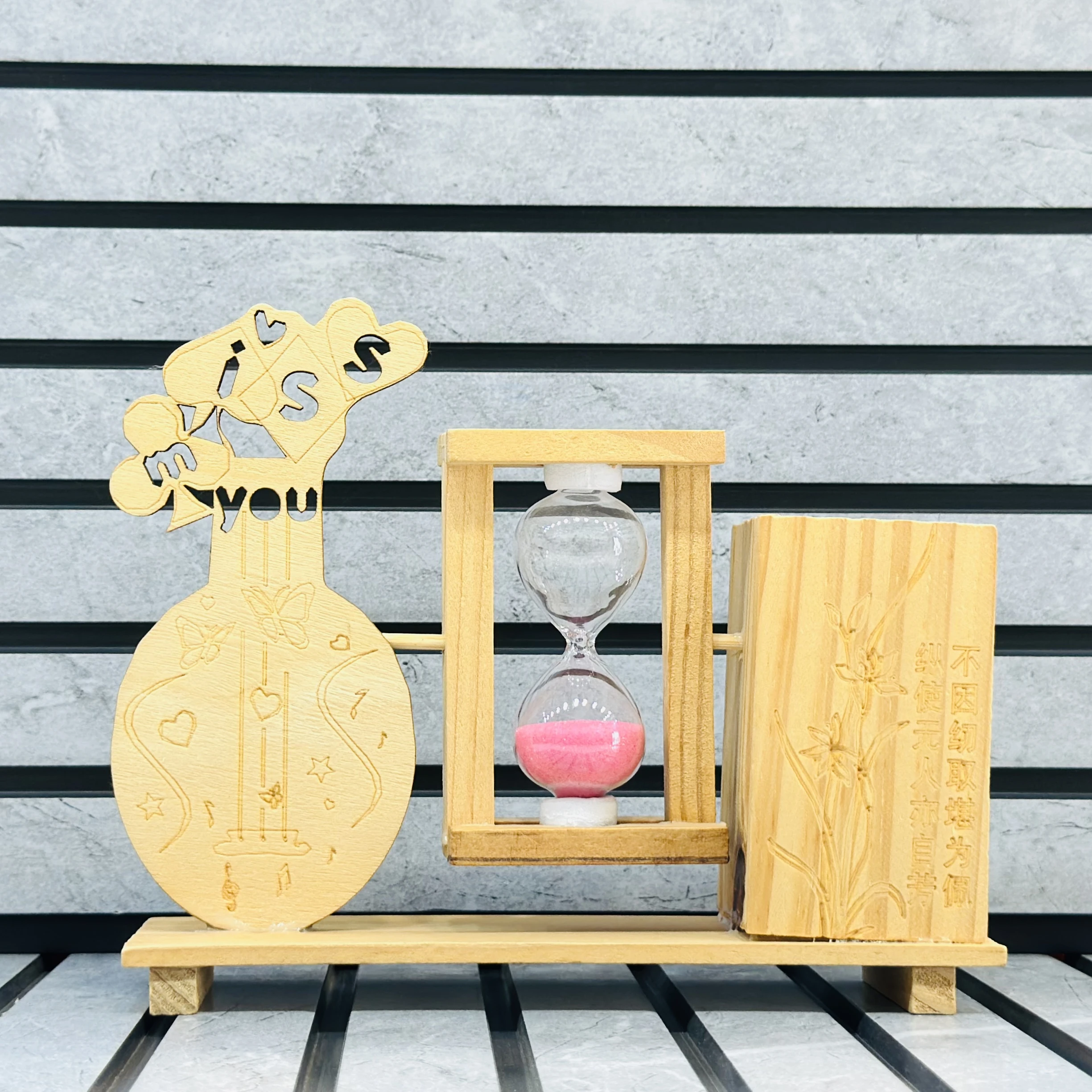 π Theme :- wooden pen stand featuring an integrated hourglass timer and decorative elements.