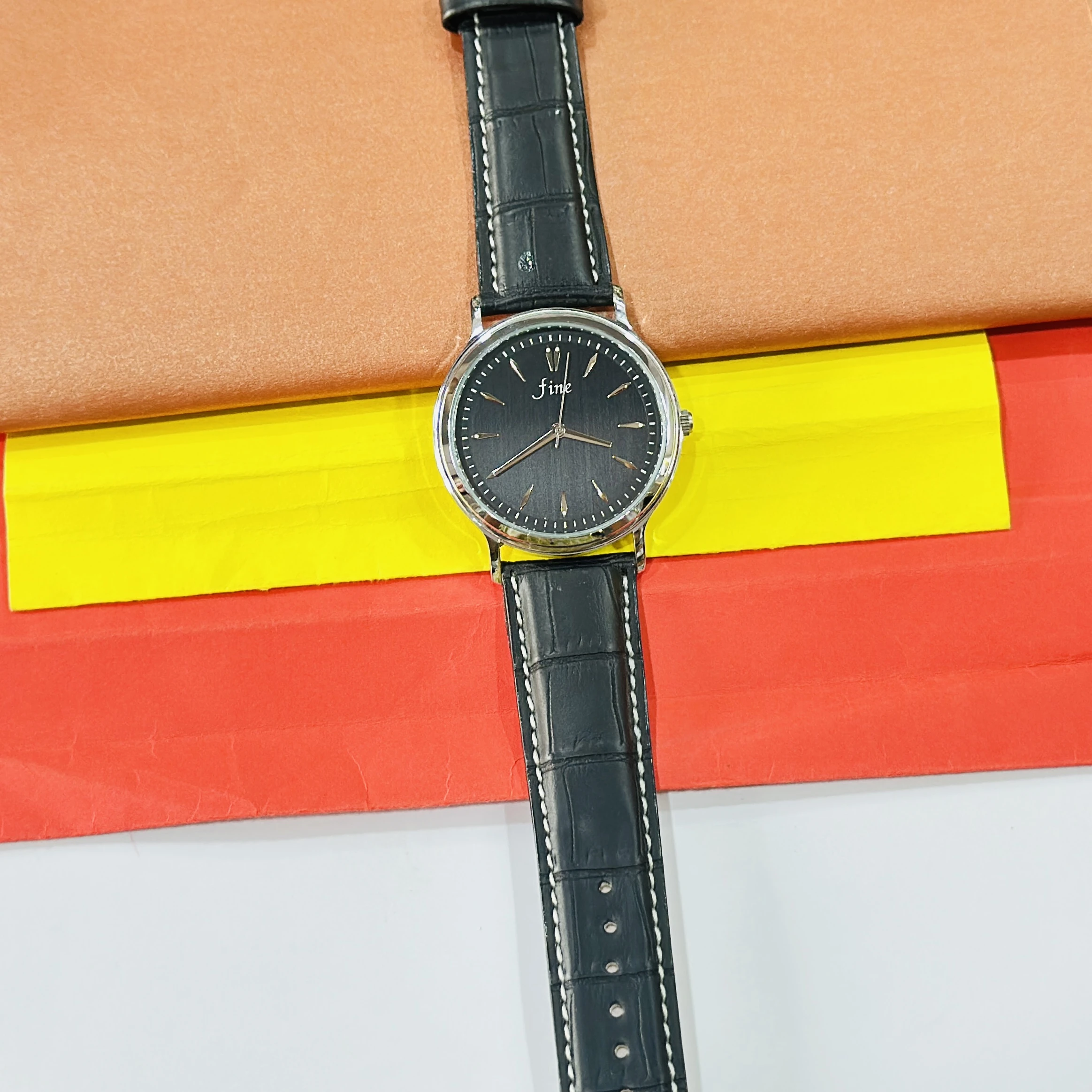 wrist watch featuring a black dial branded as "fine" and a black leather strap.