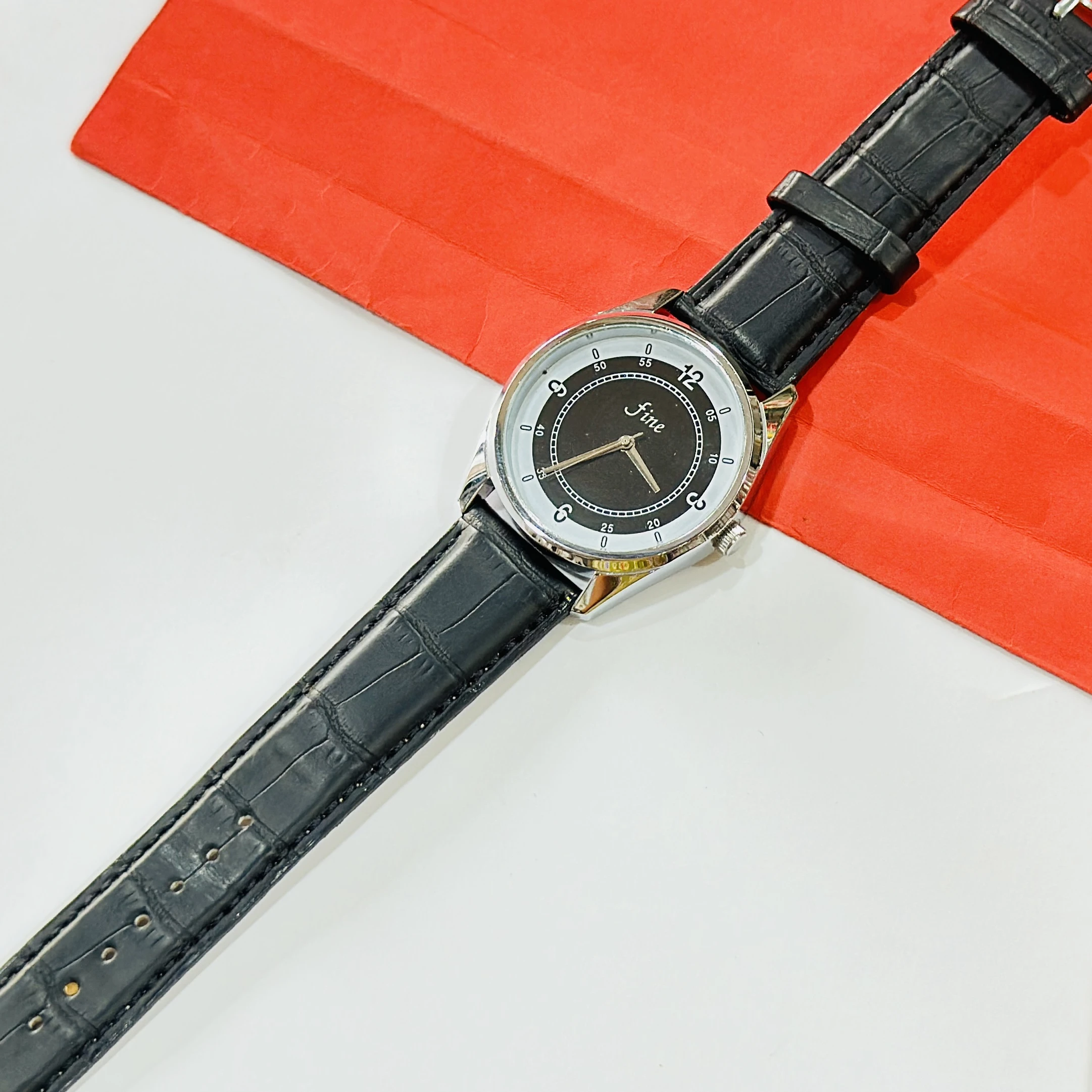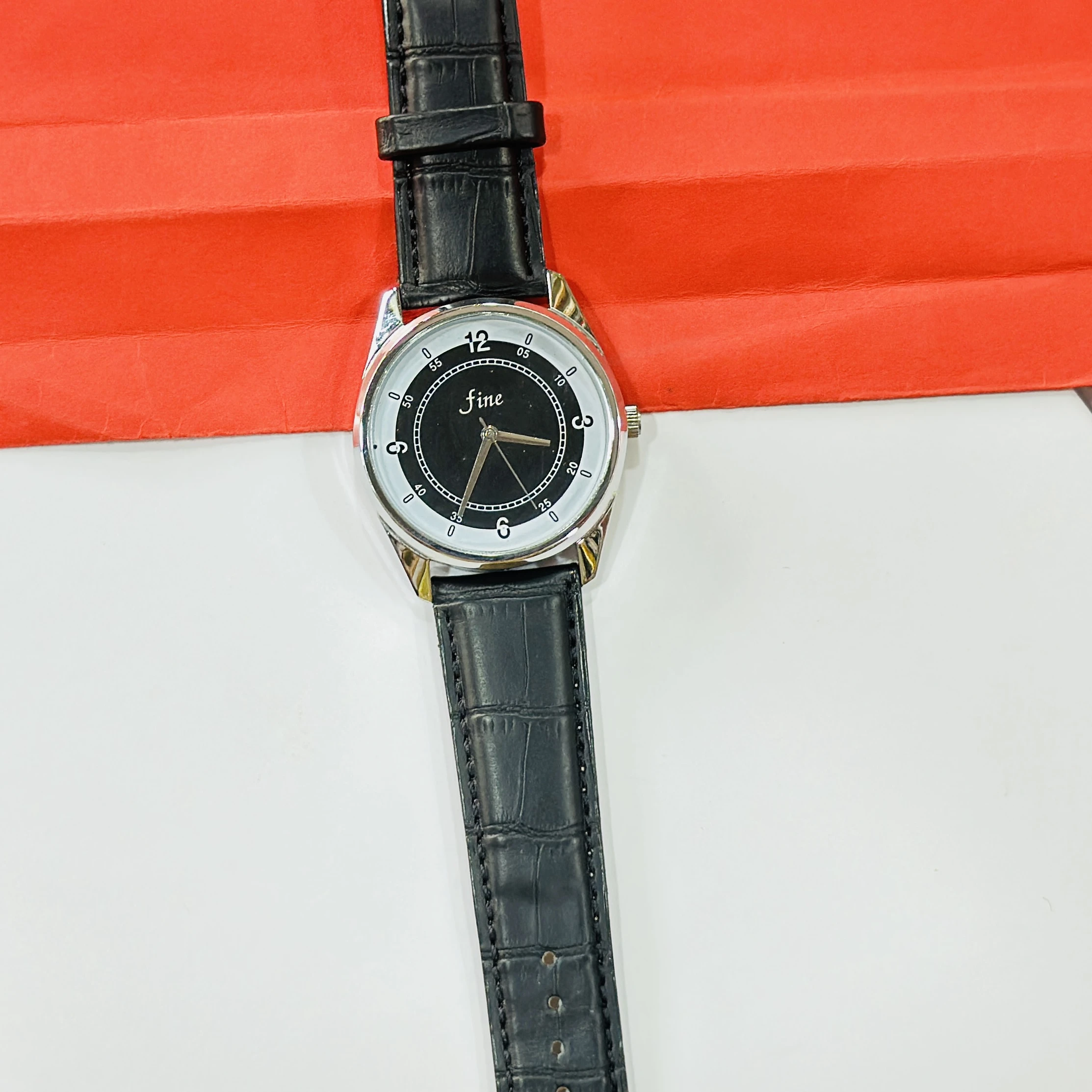 👉Theme :- wrist watch featuring a black dial branded as "fine" and a black leather strap.