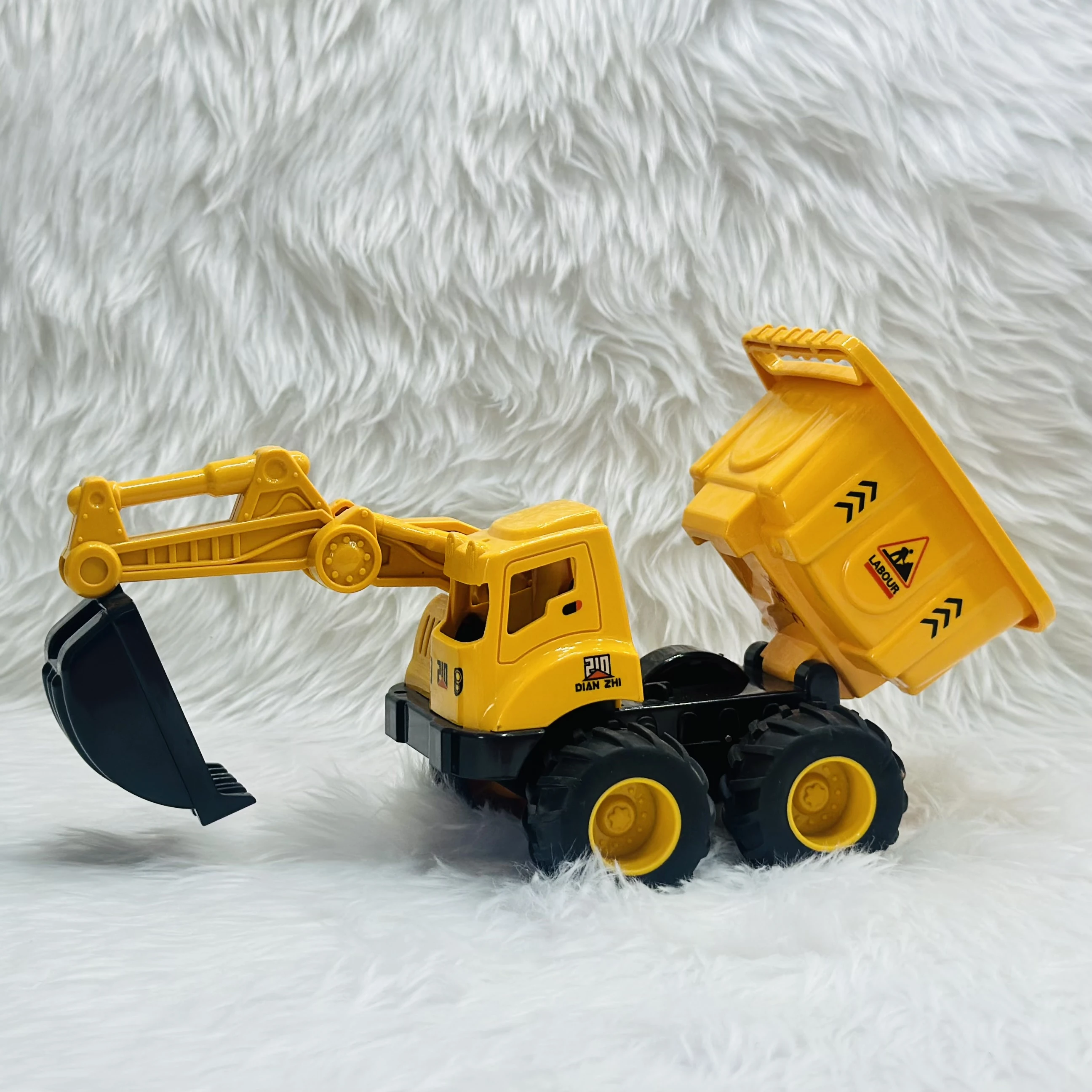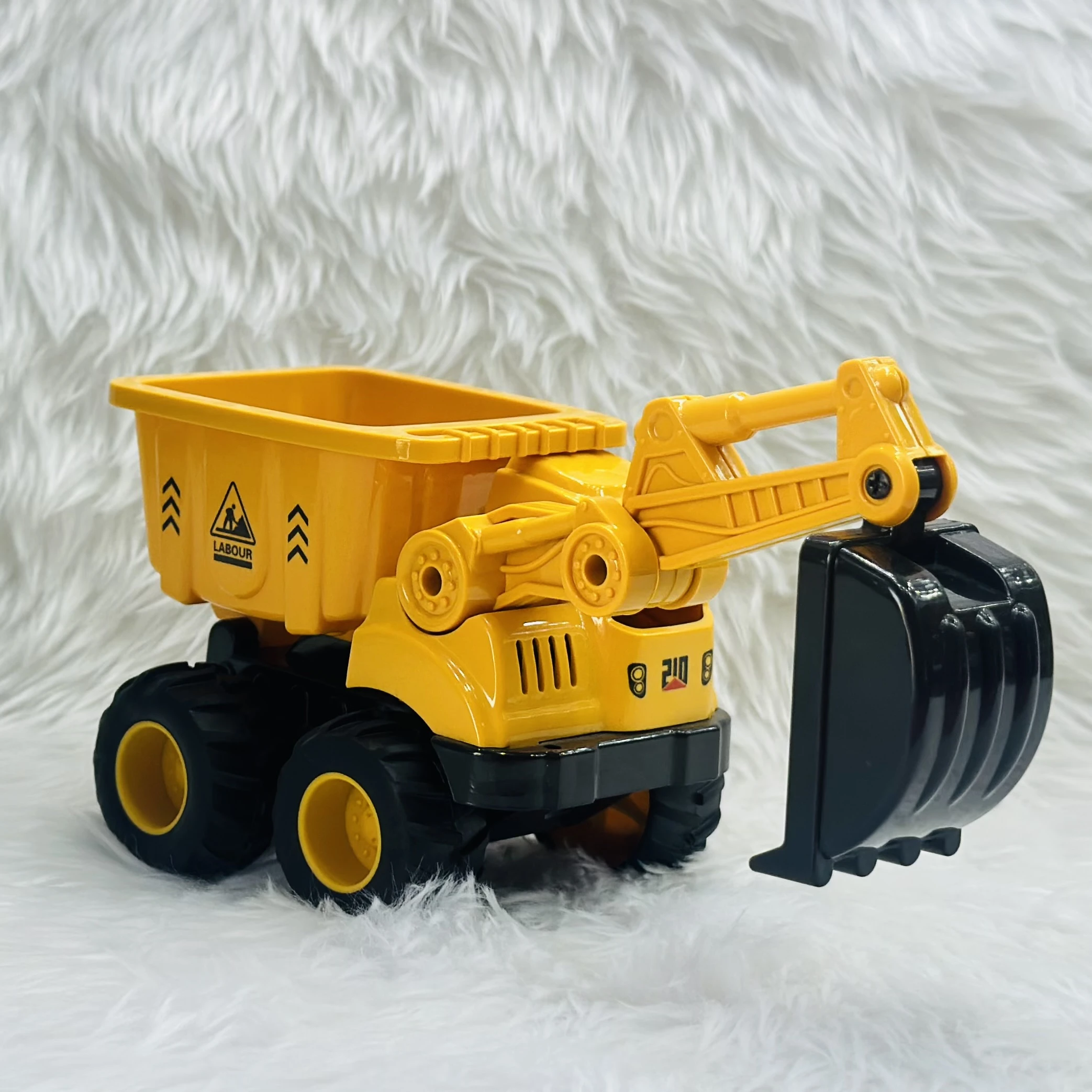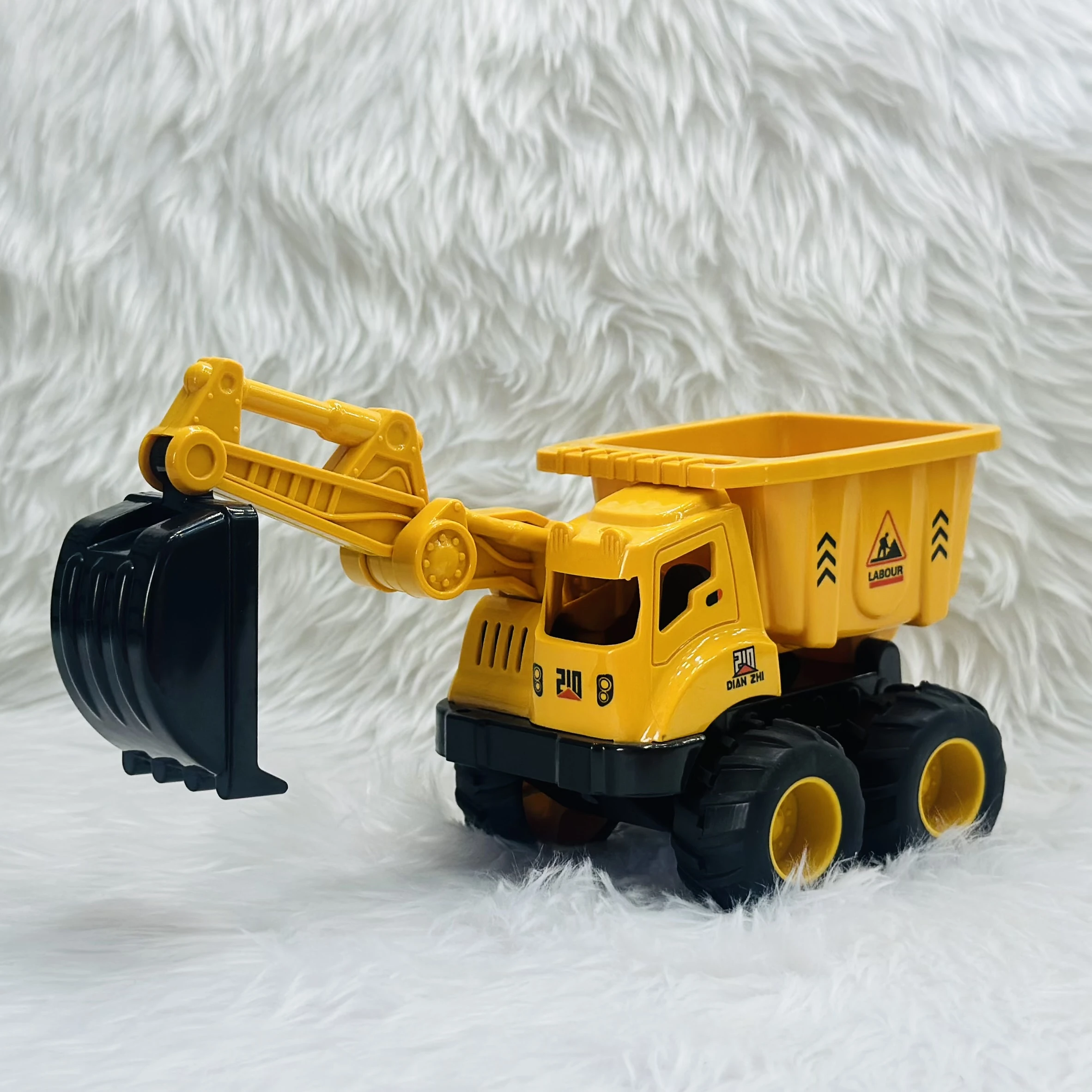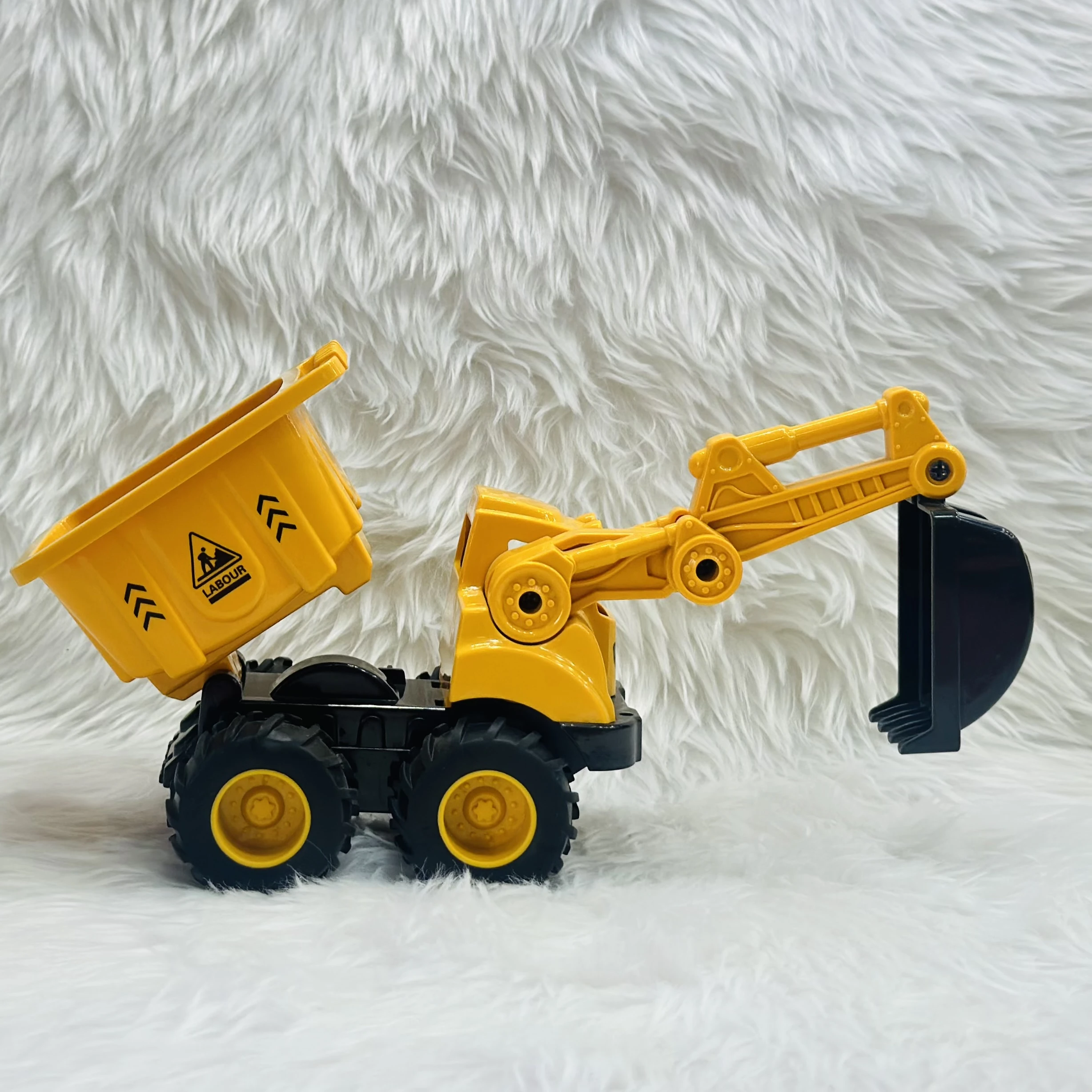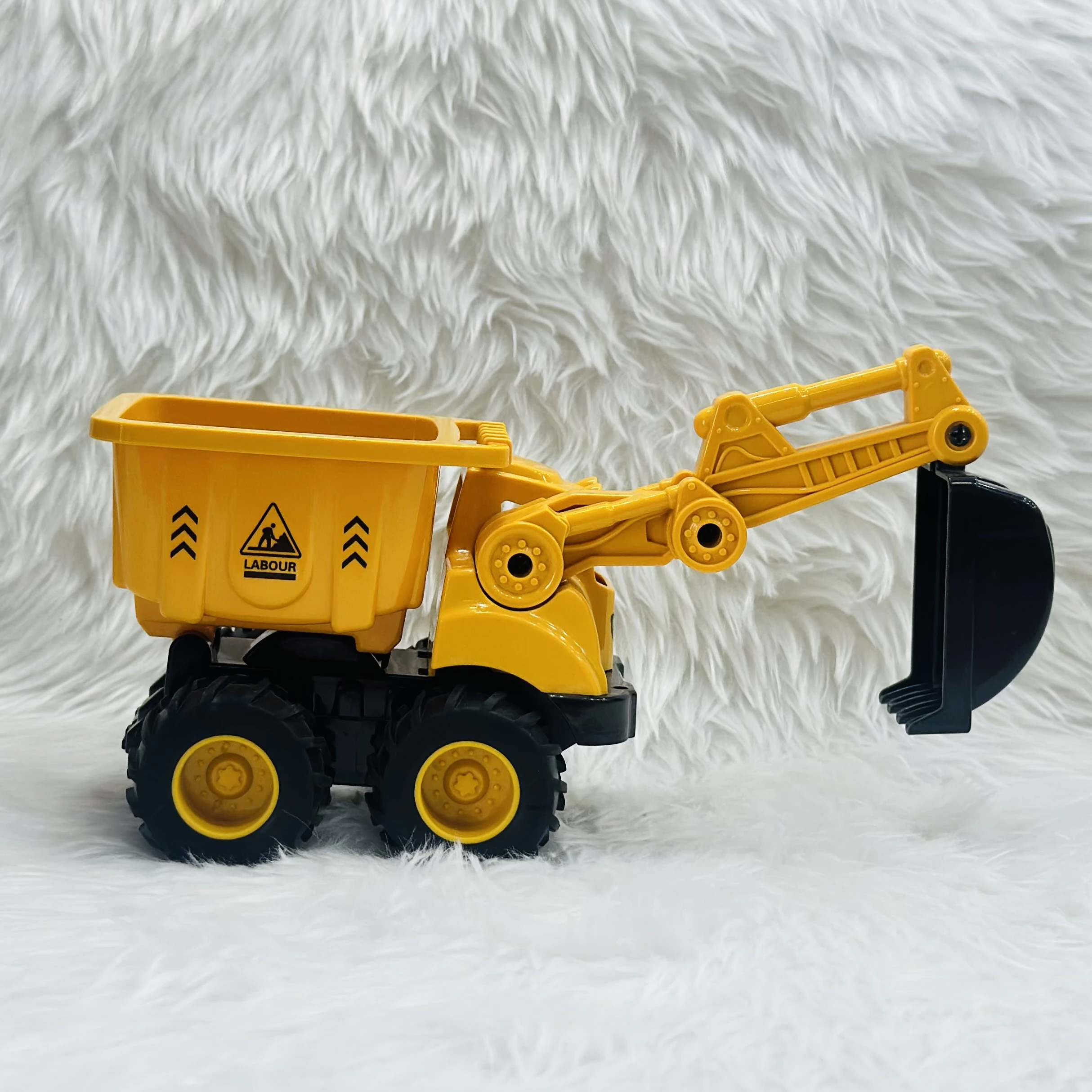 👉 Theme :- yellow plastic toy construction vehicle, specifically a 2-in-1 friction-powered dumper and excavator truck.